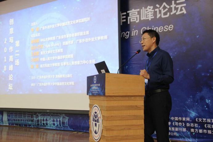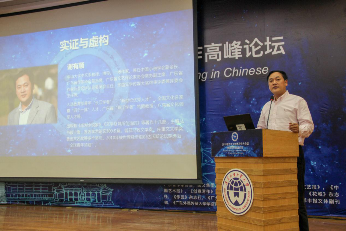 首先,谢有顺发表题为《实证与虚构》的演讲。他强调:“想象力是创意写作的核心,我们应该倡导对不确定知识的追求,以形成个体的审美能力”。他还说道:“物化的、确定的知识正阻碍着这种能力形成,如今人们探索太空的愿望在减弱,想象力在衰微,便是最好的例证。”他结合实际提出观点:普罗大众不应该太过迷信科学,在人工智能迅速发展的今天,仍然需要保持想象力。同时他又以《<三体>中的物理学》一书为例证,说明想象力虽可天马行空,但仍要对其保持警觉,要讲究实证,立足于实践,要“受现实的启发与限制”,不能过分虚无。
