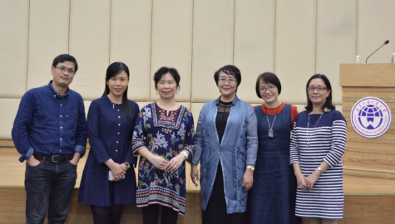张翎与到场的中文学院老师合照。左一起:朱志刚、林炜娜、张翎、刘海玲、申霞艳、李惠娟)