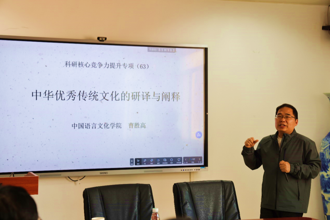 中华文化国际传播研究院执行院长曹胜高教授详细介绍了项目研究思路、研究计划和实施方案。项目总体实践分成四个部分,一是中华文化经典的外译、研究与传播;二是世界其他文明对中华文明的认知、认可与认同;三是中华优秀传统文化的阐释话语体系建设;四是借助国际中文教育提升中华优秀传统文化国际传播力影响力对策研究。