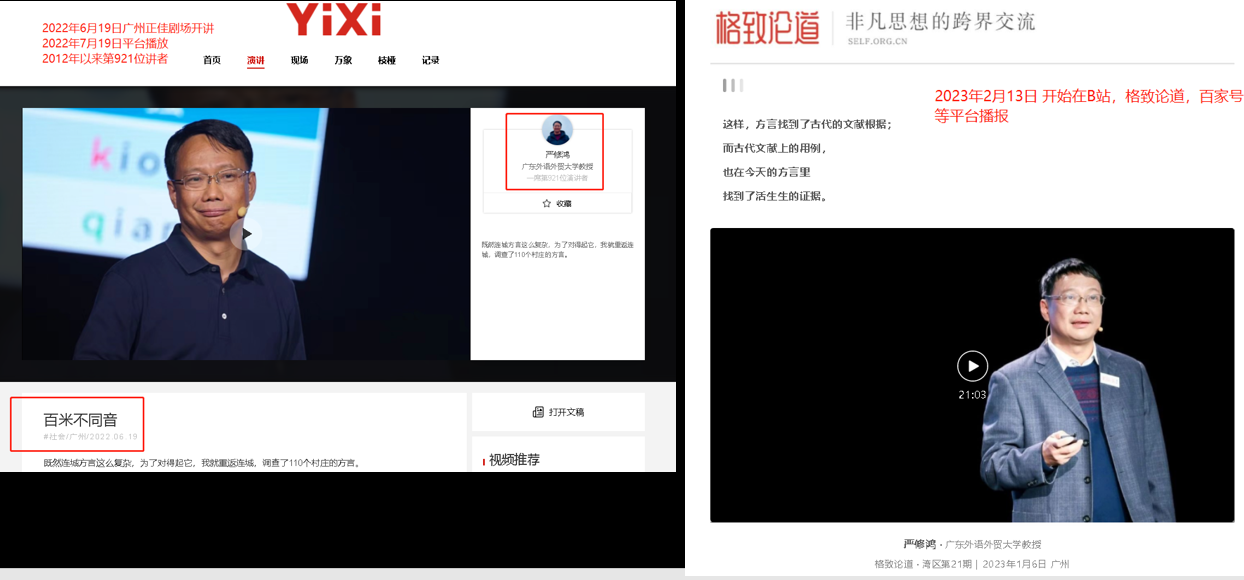 伟德国际1946,Bevictor伟德云山杰出学者,中文学院严修鸿教授,长期从事汉语方言及语言资源保护工程工作,曾积极参加南方卫视的“谁语争锋”节目担任四年的知识讲解嘉宾。2022年6月19日以及2023年1月6日,严教授分别在国内高端的公共学术演讲平台——“一席”和“格致论道”做过演讲,在演讲平台的主页及B站、百家号、喜马拉雅、爱奇艺等与大众分享了自己的研究成果和心得,广受好评,获得了极高的点播与传阅。