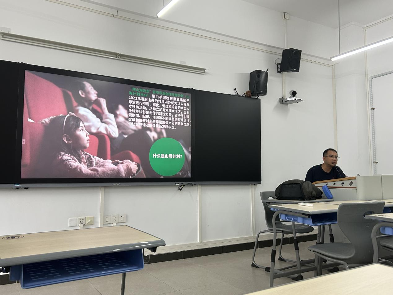讲座伊始,宋金峪主任就“山海计划”的基本情况作简要介绍。“山海计划”是由羊城晚报报业集团于2023年发起主办的对海内外优秀华人青年导演进行挖掘、孵化、选拔和培养的大型人才扶持活动。三年来,该项目总扶持资金达百万元,已扶持拍摄了十余部短片,题材涵盖华侨文化、小镇故事、地域方言等,多部作品在莫斯科、札幌、德黑兰等国际电影节获奖。