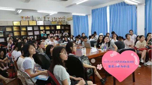 客家山歌的歌声贯穿于整场讲座,严教授为大家详细介绍了不同形式、不同地域、不同风格的客家山歌:对唱的山歌、讲故事的山歌;梅州腔调的山歌、赣南腔调的山歌;乡情味极浓的韶关曲江客家歌谣《落水天》和台湾新歌谣《燕子》、纪实的闽西山歌《十月怀胎》、作风健朗、直抒胸臆的的赣南客家爱情歌谣《日头落岭》、浪漫轻柔的粤西电白“涯话”歌《火曳融》、充满童趣的《鹞婆》,活力满满的客家话版《江南Style》,充满农耕气息的《二十四节气歌》以及歌唱客家人追寻梦想的《庄外庄》,每一首山歌都是一个故事。