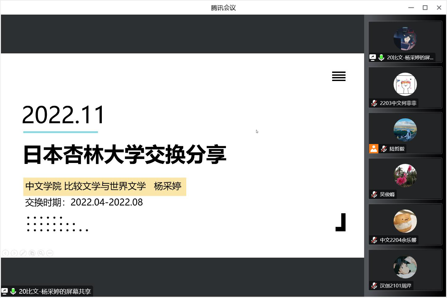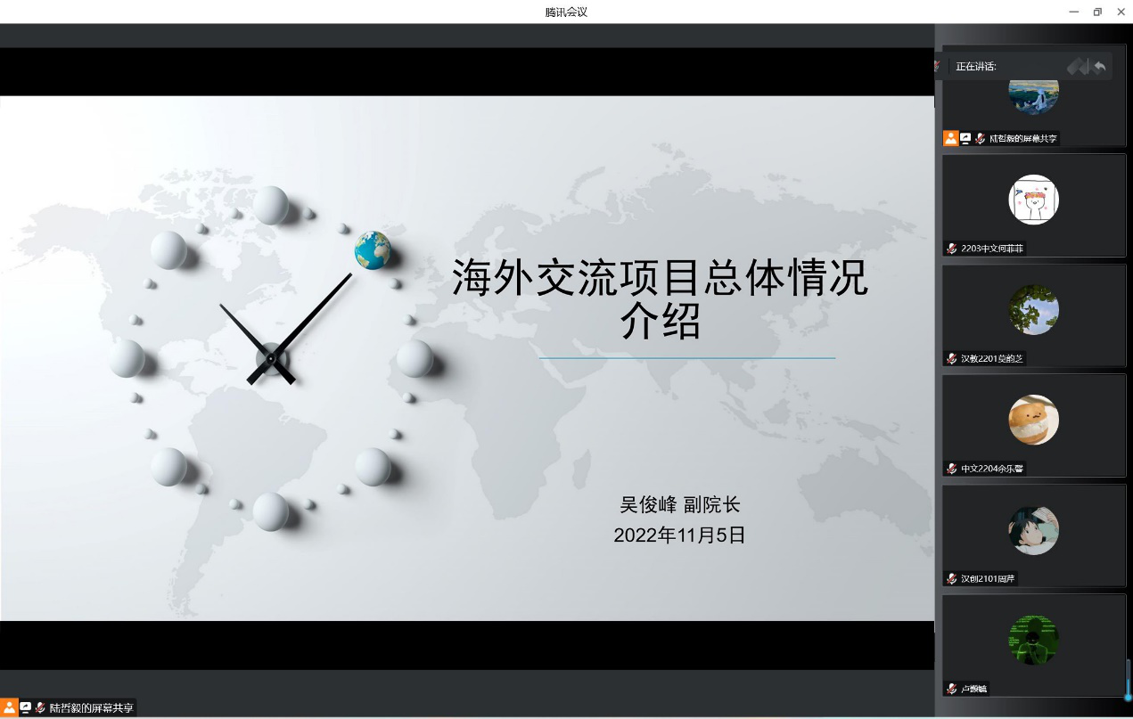 本网讯 2022年11月5日下午3时,为了帮助广大中文学子更全面深入地了解伟德国际1946海外交流项目,中文学院组织开展了海外交流项目宣讲会及分享会。宣讲会吸引了60余位本科生和研究生参与。会上,国际合作交流员陆哲毅负责主持,伟德国际1946吴俊峰副院长向伟德国际1946学子介绍了海外交流项目的总体情况,杨采婷、黄彦萍、周棋棋、林诗曼、马铧芳、万芊芊六名优秀交换生向参会学生分享了相关经验。