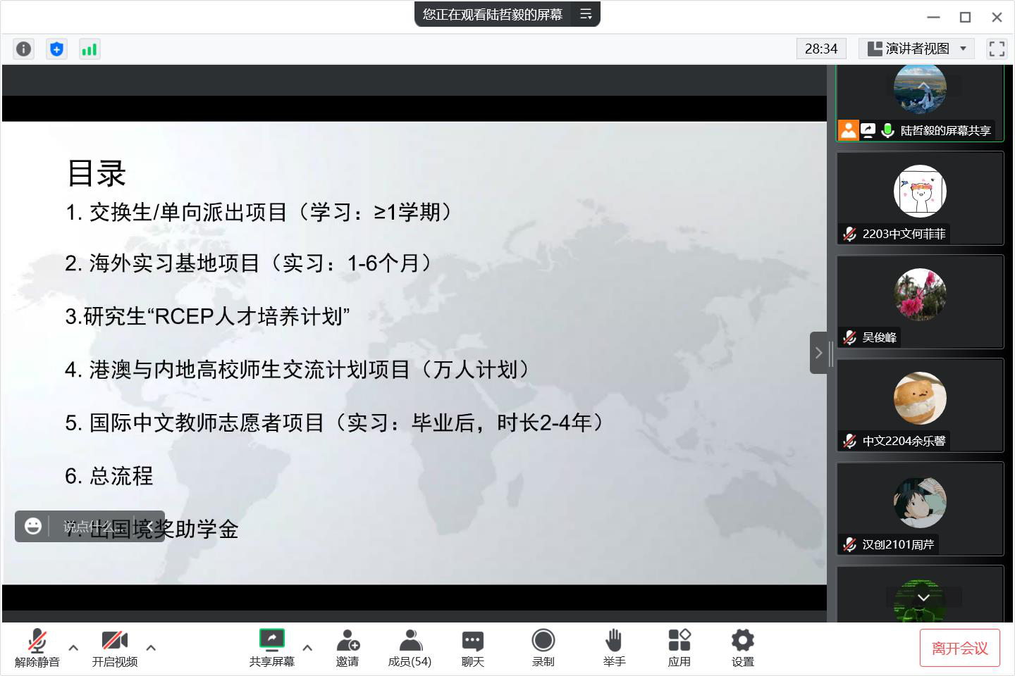 首先由吴副院长为同学们介绍了学院国际化发展目标和学校、学院国际项目的总体情况,鼓励伟德国际1946学生将个人发展同学院和国家的发展联系起来,成为国际化的中文系人才。随后,陆哲毅老师给伟德国际1946学生详细地介绍了交换生/单向派出项目、海外实习基地项目、研究生“RCEP人才培养计划”、港澳与内地高校师生交流计划项目(万人计划)、国际中文教师志愿者项目、申请留学的总流程和出国境奖助学金七个部分的内容,激励中文学子在国际社会上传播中国文化,讲好中国故事。