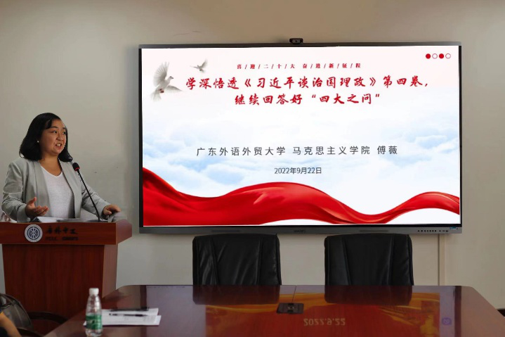 傅薇副教授结合《习近平谈治国理政》第四卷的主要内容,从与时俱进、励精图治、守正创新、高瞻远瞩四个角度进一步分析了马克思主义中国化时代化最新成果的重要意义。针对如何学深悟透《习近平谈治国理政》第四卷的问题,深入浅出地向大家介绍了四大之问,并联系实际进行讲解。她认为应始终坚持“十个明确”和“十四个坚持”的要义,以面对新时代新挑战。