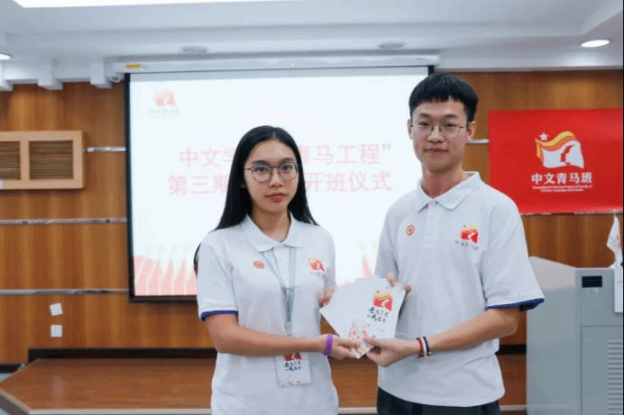 叶开老师为第三期中文学院青马班学员代表佩戴班徽