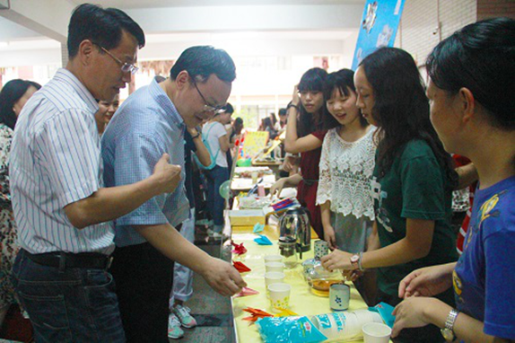 云南美景展区各个摊位向同学们尽情展示了云南的浪漫、纯净之美,一张张明信片、一片片书签、一幅幅图片,把苍山、洱海、玉龙雪山还有香格里拉的自然之美呈现的如梦如幻,牢牢吸引住了同学们的眼睛,忍不住驻足欣赏。看过了美景自然少不了尝一尝美食,远远地就被浓浓的馨香勾起好奇心,原来同学们早就沏好了云南普洱并且热情的向大家推荐品尝。