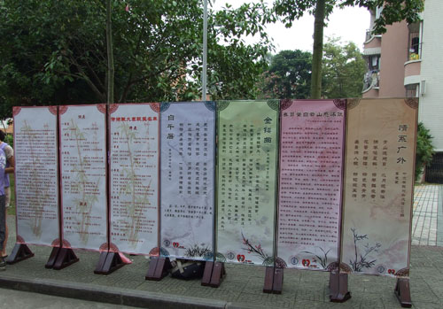 本网讯 2012年10月24、25日中午及下午,在云山学12栋前进行了校园古典诗词赋创作大赛的优秀作品展示活动。不同于往届通过晚会来展示优秀作品的方式,本次诗词赋大赛选择将一等奖作品印在屏风上进行校道展示,同时将它们制作成精美的书签,让对诗词赋感兴趣的同学可以挑选自己喜欢的作品书签留作纪念。据了解,在所有派送的书签中,最受欢迎的是印有本届诗词赋创作大赛冠军获得者、来自中文学院文管092班的吴晓丹同学所作的《金镂曲》的绿色书签。而其中的一句“醉看谁主九州权斗”,恰好也生动表现了此次大赛优秀作品的丰富之状。