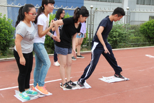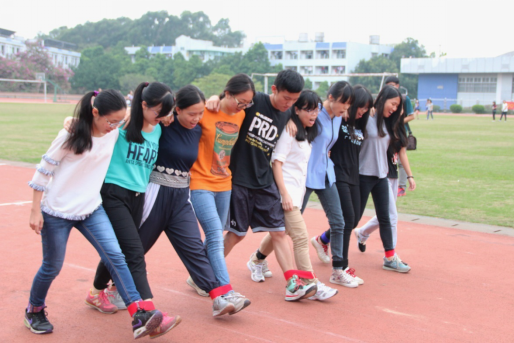 本次趣运会气氛最热烈也最令人期待的比赛就是“十人十一足”了。各班派出十名选手,用绳子将相邻两人的脚绑在一起,跑过30米,用时少的队伍获胜。比赛开始前,各班选手就已经紧张地练习起来了,整齐响亮的口号回旋在操场上。比赛时,选手们齐心协力,手搭手,肩并肩地迈着整齐的步伐前进。有的班级更是默契十足,快速地跑向终点。最终,文管13十人同心,以8秒13的最快成绩获得本项目的第一名。