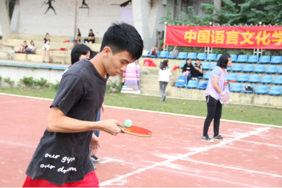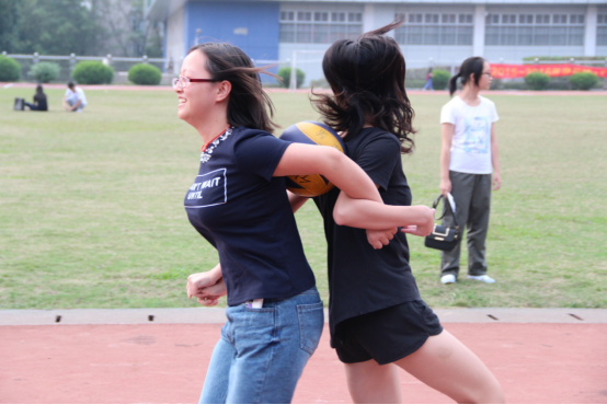 第一个比赛项目是“玩转大小球”,每班派出五名同学参加比赛。比赛要求每支队伍中的两名同学在起点处挽手背对背夹起一个排球跑向终点,到达终点后,在终点的一名同学用乒乓球拍托起乒乓球返回。比赛在大排球和小乒乓球都不落地的情况下才能继续进行。用时越少得分越高。比赛在热烈的欢呼声中开始了,夹着排球的选手们有的一步步默契前进,有的因速度加快乱了步伐,滑稽的动作引人捧腹大笑。而托着乒乓球的选手们大都大步流星迈向终点线,球拍上的小球却丝毫不受影响。1503班的一名选手更是托着乒乓球向终点飞跑过去,引来观众们的一阵赞叹。最终,1503班以34秒52的成绩拿到了8分,夺得本项目的第一名。