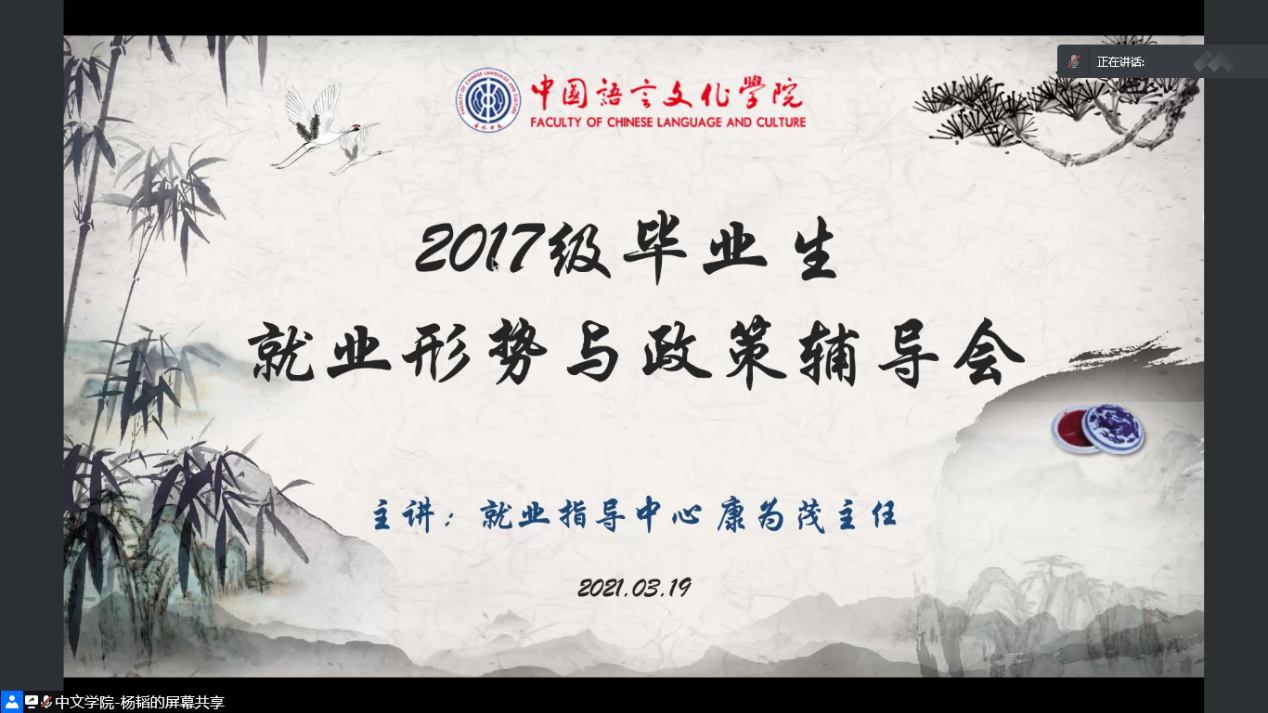 2021年3月19日下午,中文学院2021届毕业生就业形势与政策辅导会在腾讯会议线上举行,本次指导会邀请广外就业指导中心主任康为茂主讲。活动由学院副书记王迪主持,各年级辅导员参加活动和全体毕业生参加。