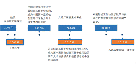 汉语言文学专业成立于2005年,2006年正式招生,2012年设置创意写作专业方向,2016年入选广东省重点专业,2018年获得广东省教育教学成果奖二等奖,2019年入选国家级一流本科专业建设点。